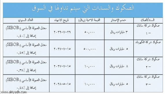 وكشفت "تداول" أنها ستضيف في مرحلة لاحقة صكوك وسندات أخرى إلى الإصدارات الأربعة الحالية لسابك والكهرباء والتي سيبدأ تداولها غدا.
